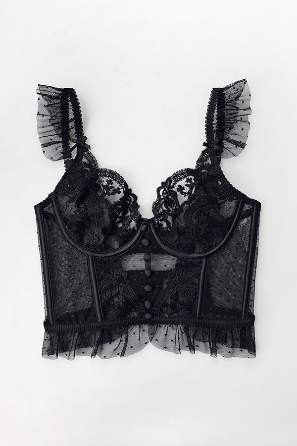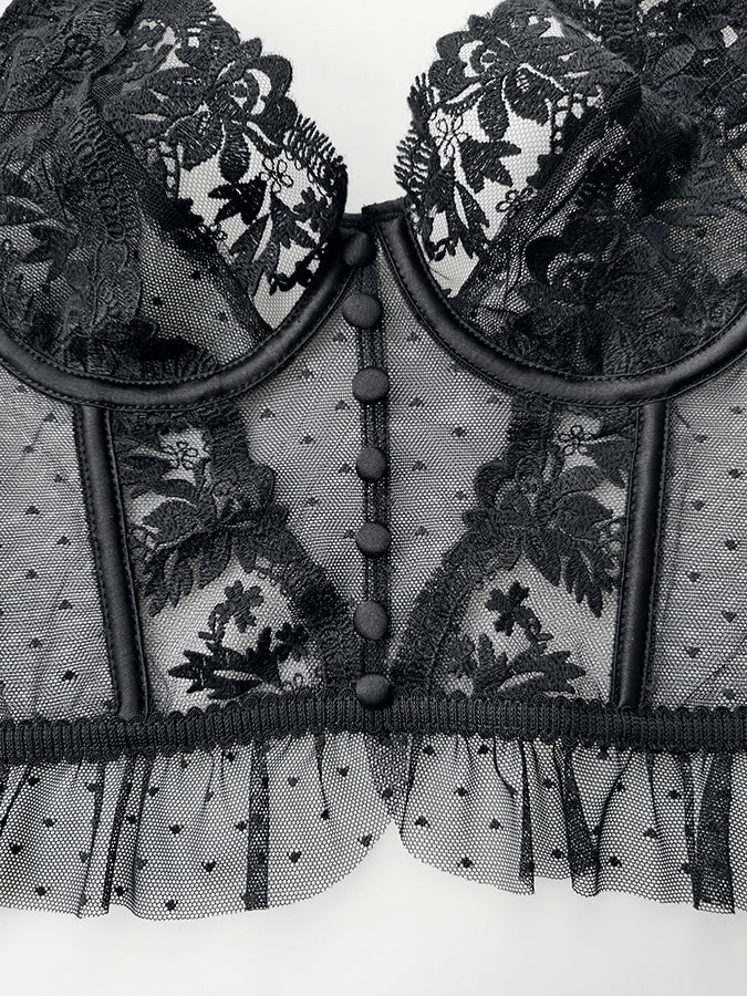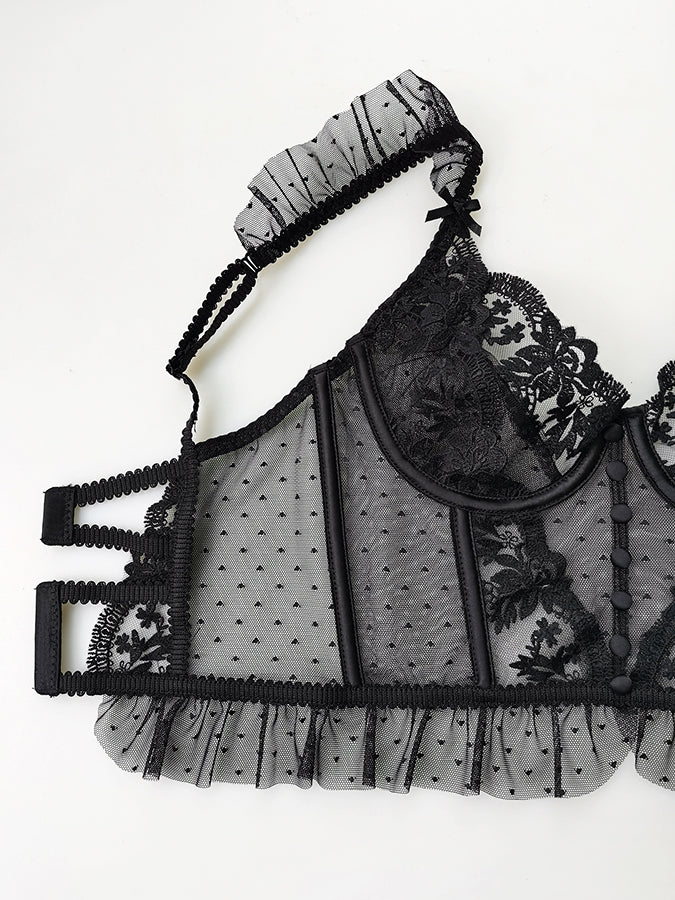 Own the room in this captivating black lingerie set with floral embroidery, dotted mesh textures, and a statement-making silhouette. The balconette-style bustier hugs in all the right places while the ruffled edges add a soft, romantic finish