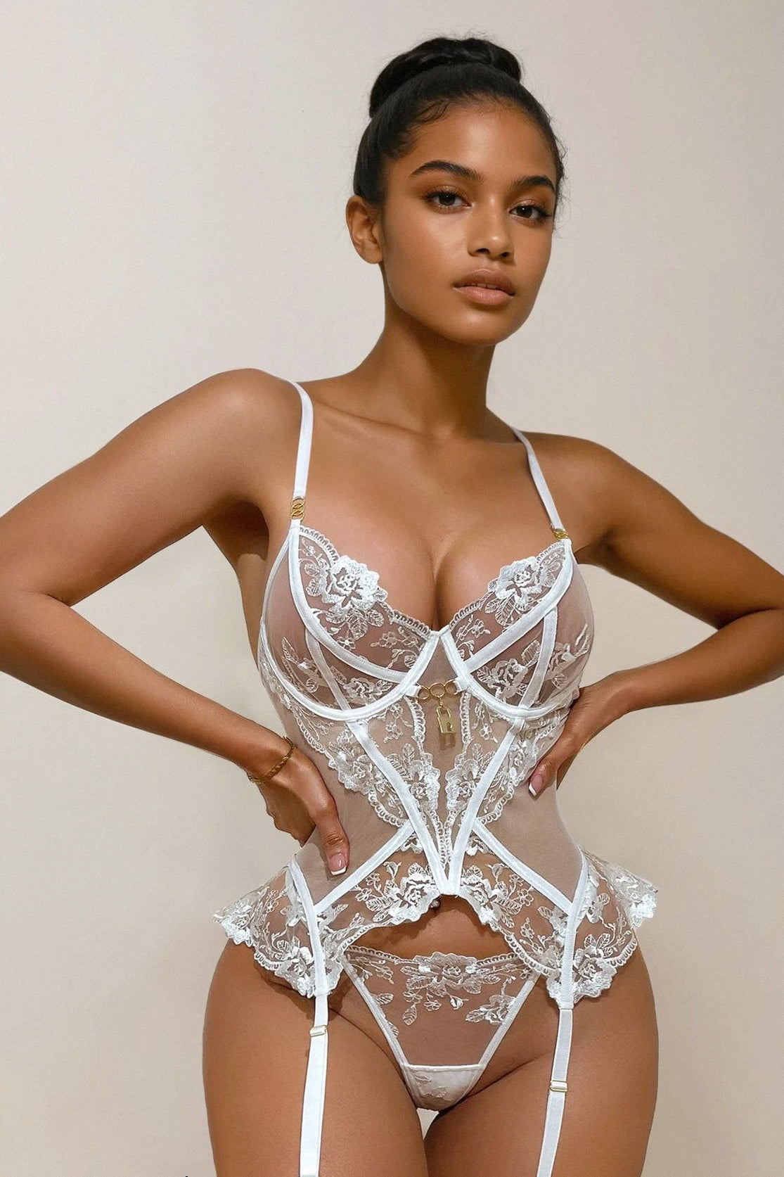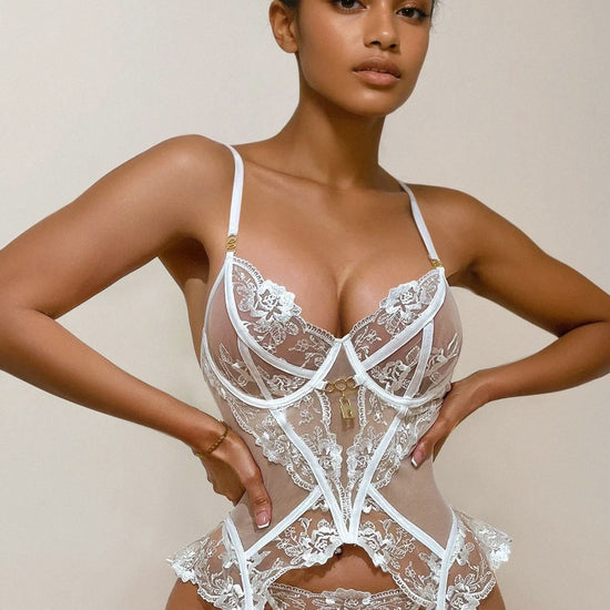 Softly ethereal yet undeniably captivating, the Daria Set captures the essence of angelic grace and modern romance. Designed for the bride and beyond, its intricate white lace and satin details illuminate every curve with quiet confidence. Perfect for celebrating love — in every form.