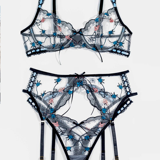 Delicate meets daring in this sheer embroidered lingerie set, designed with intricate floral stitching and bold strap detailing. From the underwire bra to the matching garter belt and thong, every detail flatters your curves and fuels your confidence.