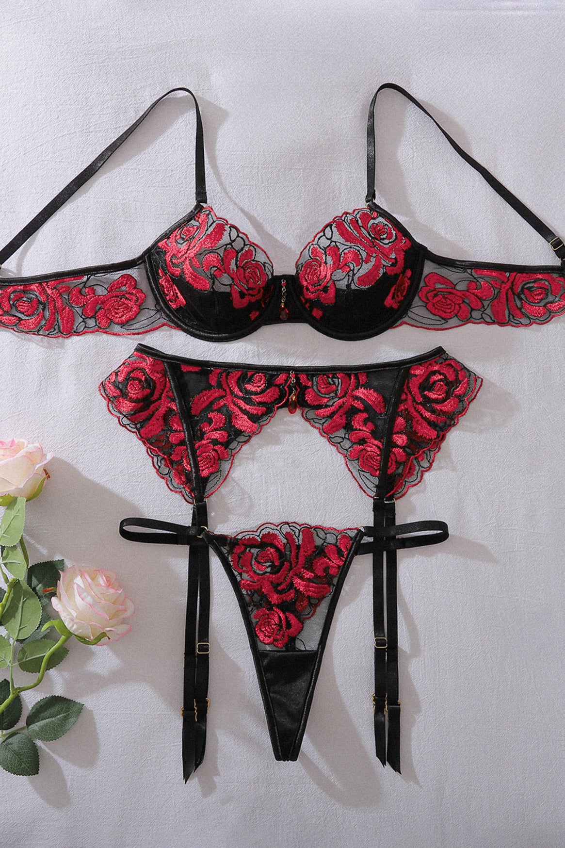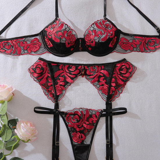 Turn heads in the Camila Set—black mesh embroidered with vivid red roses, finished with a sculpting garter belt and a flirty thong. A show-stopping lingerie look for romantic nights, anniversaries, and holiday gifting.