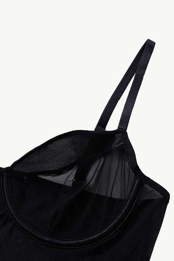 Bold yet effortlessly elegant, this black mesh teddy hugs your body with sculpting underwire cups, a seductive sheer bodice, and barely-there straps. Its ultra-high leg cut and open-back design make it a go-to statement piece for elevated self-expression.