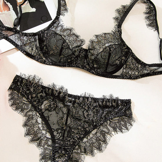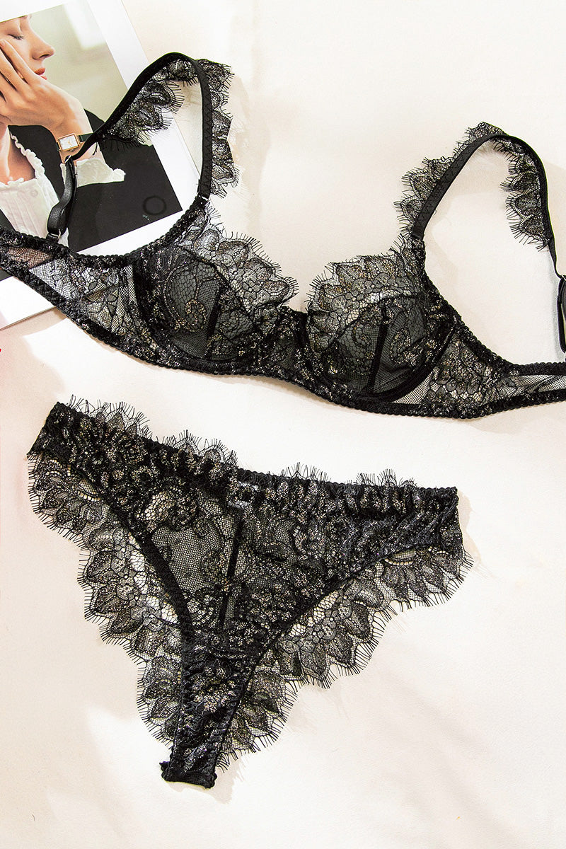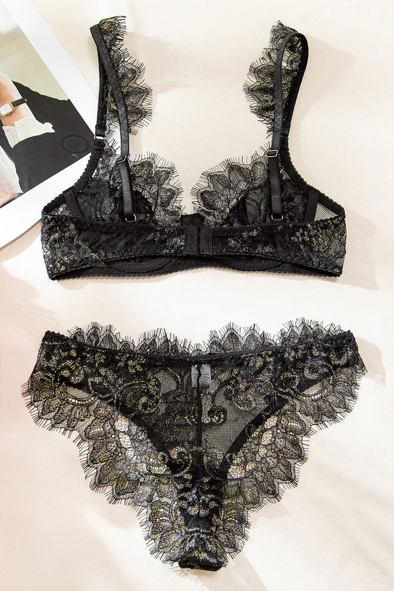 Make this Valentine’s Day feel like a private red-carpet moment in the Elia Set. The sheer black lace lingerie set is kissed with Gold metallic shimmer, giving a glow that feels romantic and a little dangerous. With its supportive underwire bra and high-leg panty, it’s the perfect matching set for celebrating love—whether it’s with someone special or just for you.