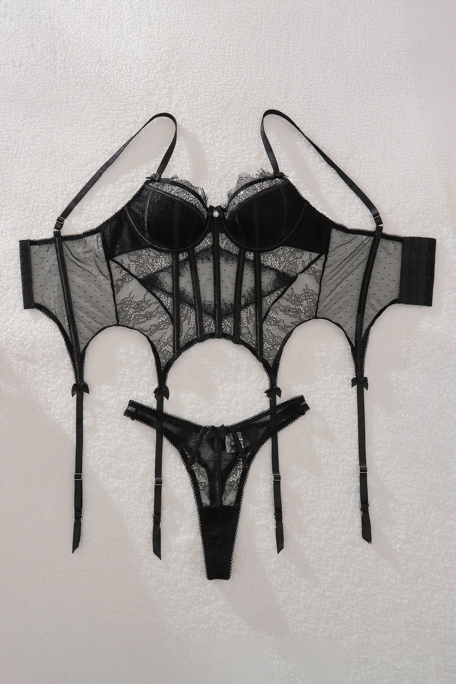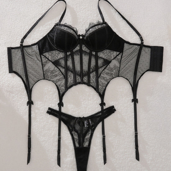 Modern romance meets classic edge in the Lucia Set. Crafted in soft black mesh and floral lace, the corset-inspired bodice sculpts your waist while eyelash trim elevates the finish. Cutout sides with garter connectors add a flirtatious touch, and the matching thong completes a look that’s made for unforgettable nights.