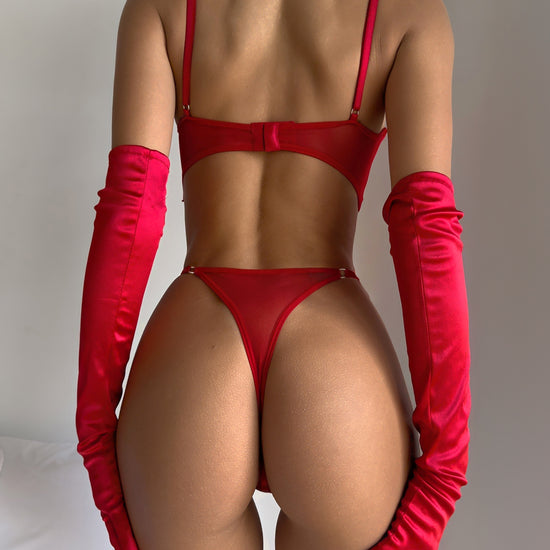 Meet your new favorite Valentine’s Day lingerie set: the Lumi Set in striking red satin. The twist-front bralette, leg-lengthening thong, and matching gloves create a flirty, editorial look that’s perfect for romantic nights, Galentine’s plans, or capturing content you’ll love. Designed to be both comfortable and bold, it celebrates every curve with a glossy, body-skimming finish.