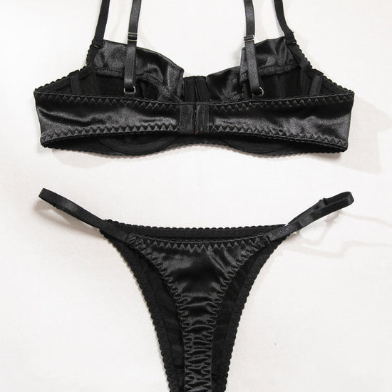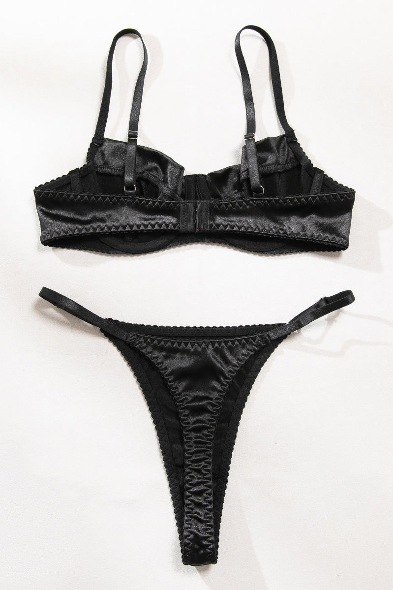 •Black satin balconette bra and matching thong